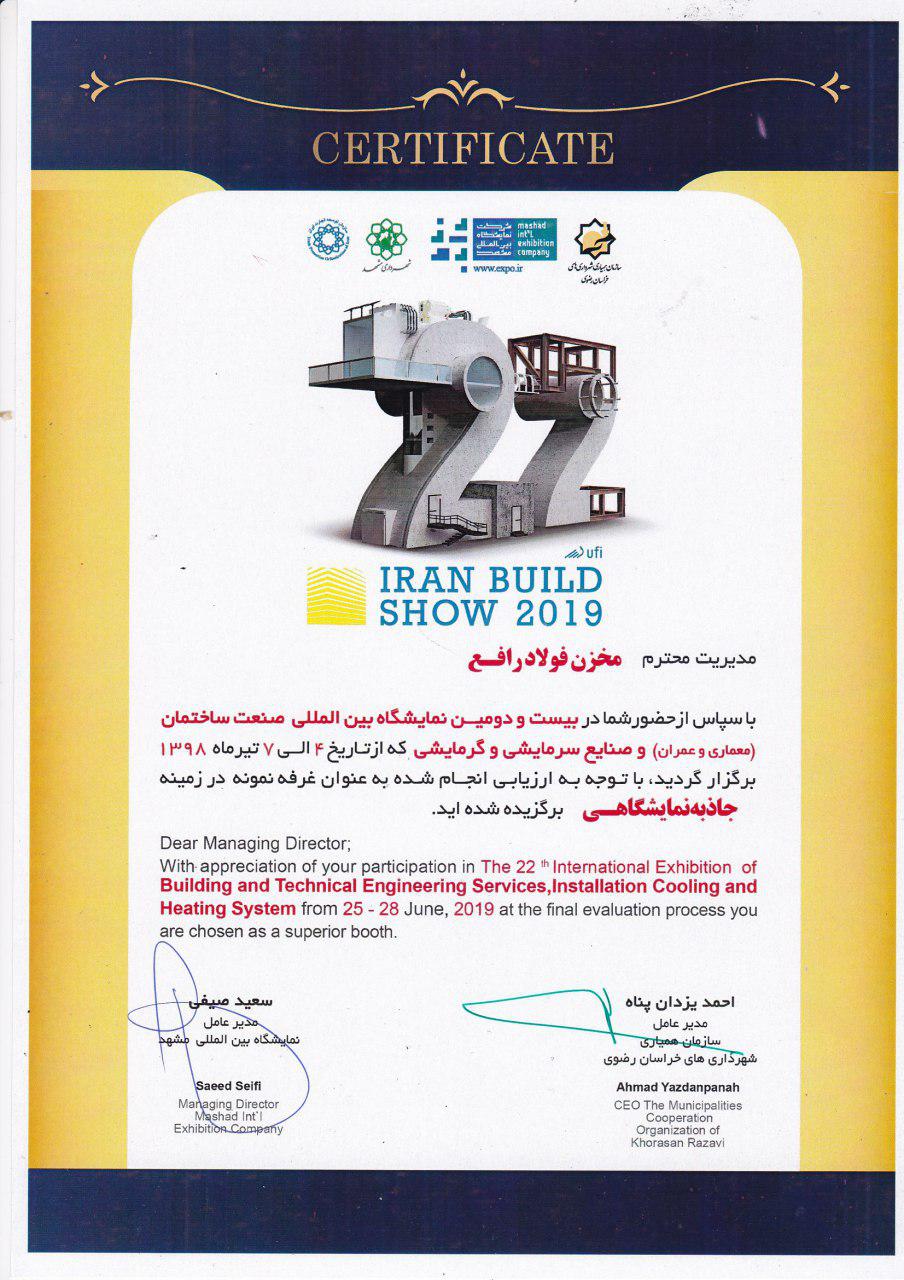 بیست و دومین نمایشگاه صنعت ساختمان، عمران و معماری و صنایع سرمایشی و گرمایشی مشهد با تلاش سازمان همیاری شهرداریهای خراسان رضوی و با حضور شرکت دانش بنیان مخزن فولاد رافع (دابوصنعت) و همچنین ۲۵۰ شرکت شامل نمایندگیهای تولیدکنندگان و ارائه دهندگان داخلی و خارجی محصولات و خدمات حوزه ساختمانی، عمرانی، معماری، سرمایشی و گرمایشی از ۴ تیرماه به مدت ۴ روز در شهر مشهد برگزار شد.